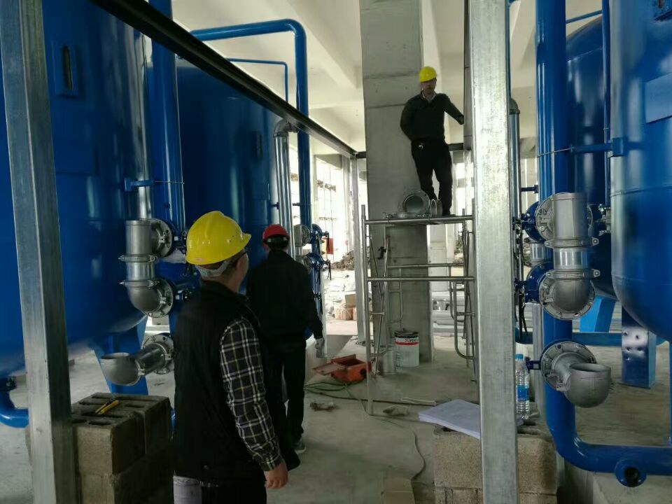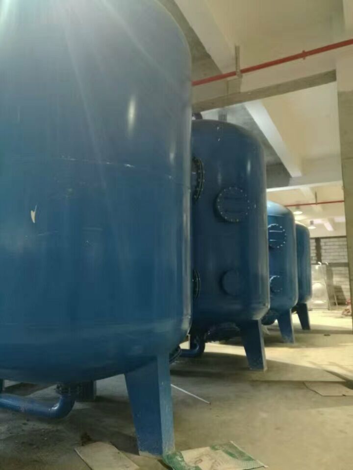 然后進(jìn)入碳濾罐:φ2.6m*5.90(總高),垂高2.8m,鋼板厚度10mm,級(jí)別Q235,內(nèi)表面襯膠防腐5mm,外表面SA2.5級(jí)噴砂除銹至金屬光澤后,噴涂阿克蘇諾貝爾油漆,內(nèi)部填充果殼活性炭。活性炭過(guò)濾器可根據(jù)其吸附機(jī)理去除原水中的余氯和有機(jī)物。