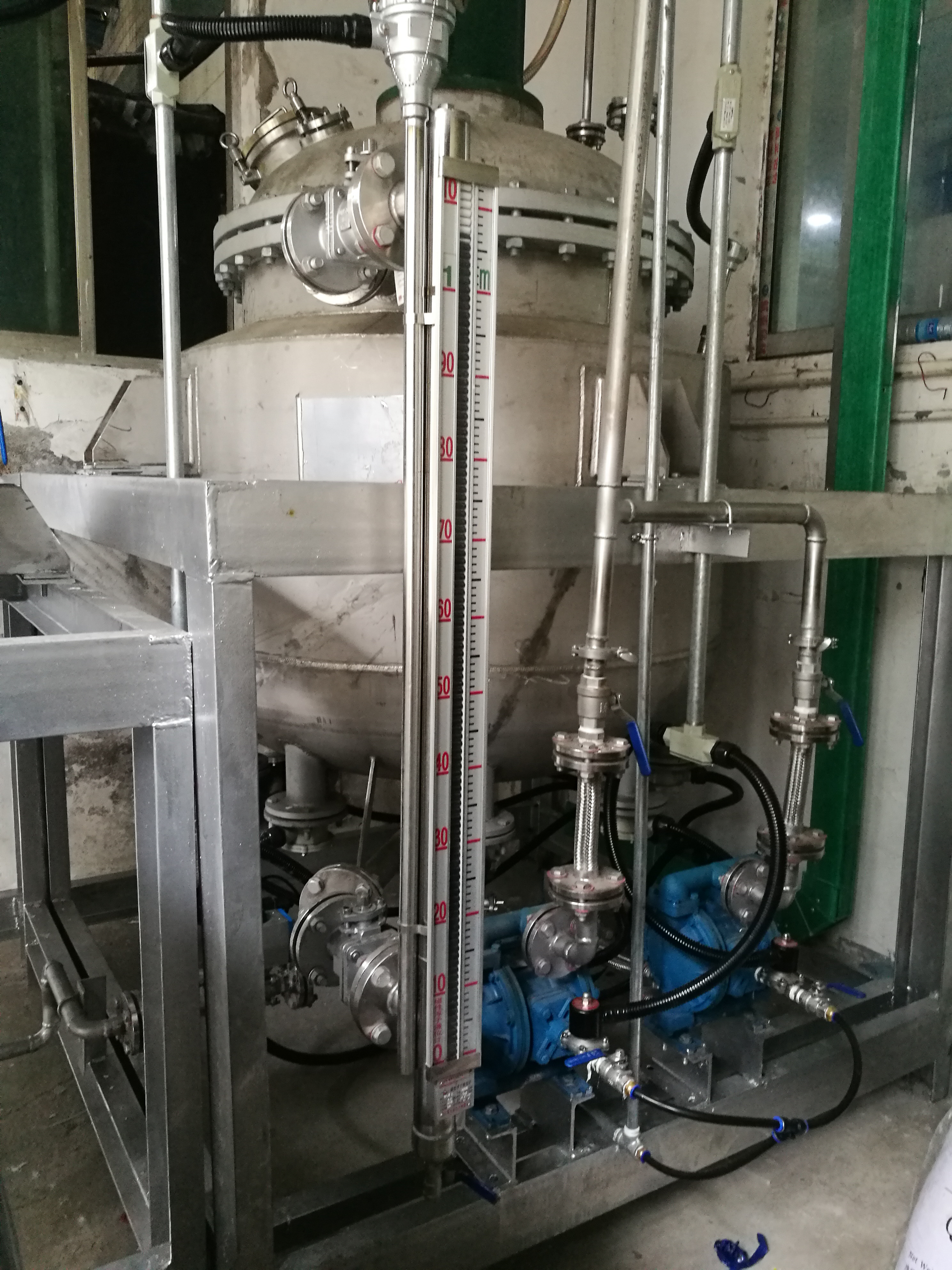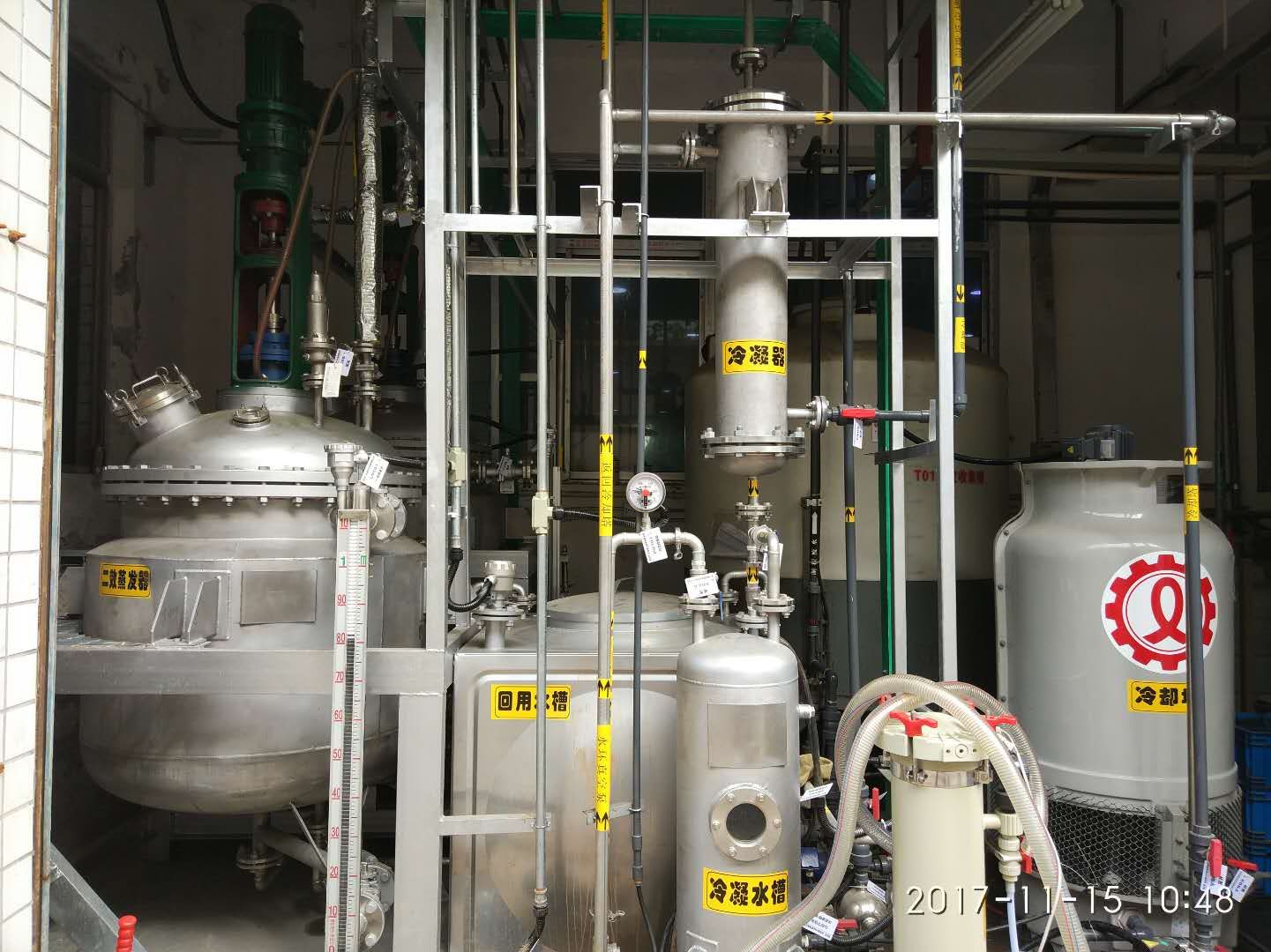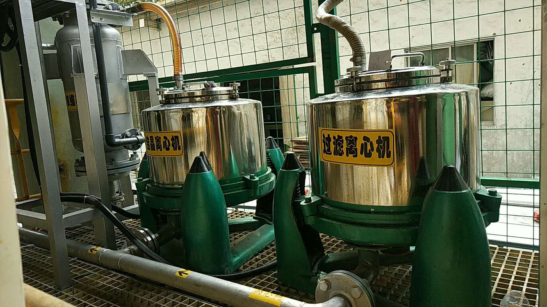 在反應釜內(nèi)的濃液被濃縮到飽和時,會有晶體析出,含晶體的混合液由泵打入離心機2中進行固液分離,卸出的固體物質(zhì)委外處理,另外的飽和液回流至濃液槽中再次進入蒸發(fā)器中。而蒸發(fā)出的蒸汽通過冷凝器進行冷卻后,形成冷凝水,進入回用水箱中,進入車間回用。